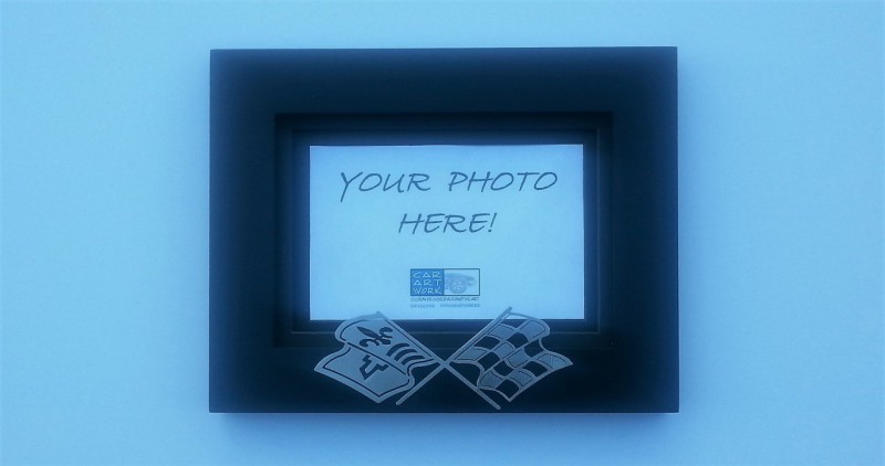 Black wood frame with brushed stainless steel emblem. Frame holds 4x6 photo with mat in and a 5x7 photo with the mat removed. Fold-out easel and hanging hardware attached
