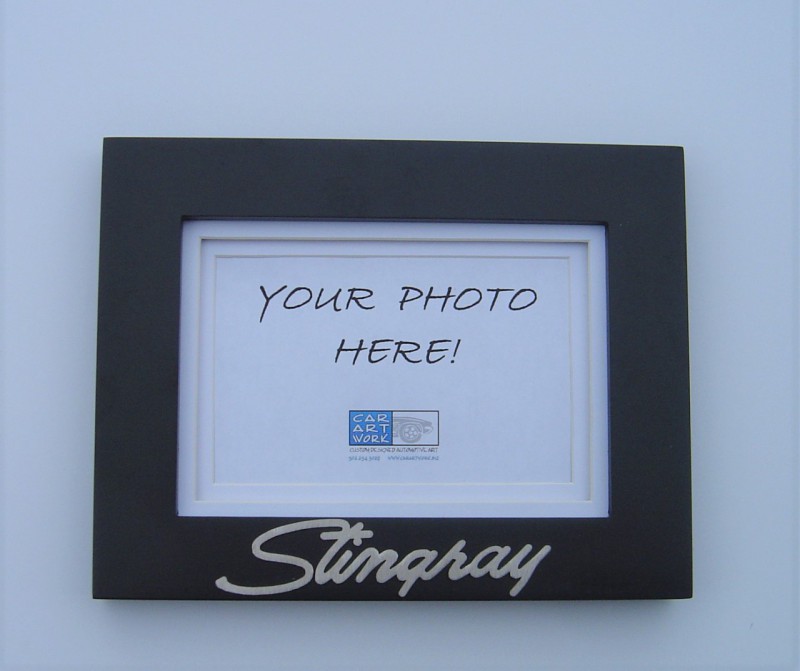 Black wood frame with brushed stainless steel emblem. Frame holds 4x6 photo with mat in and a 5x7 photo with the mat removed. Fold-out easel and hanging hardware attached