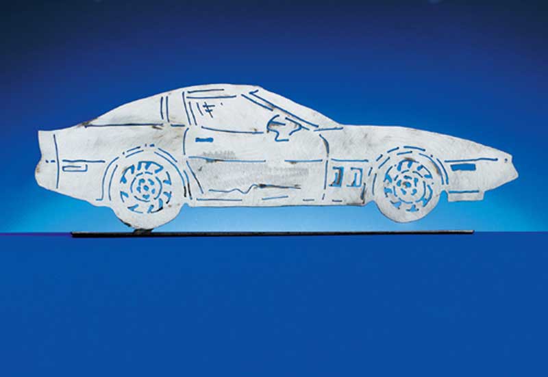 Each CarArtWork Corvette sculpture is 17 inches long and is mounted on a flat metal base. The sculpture is securely attached to the base with a single metal rod affixed to the rear of the piece. The mounting rod is positioned so that its appearance is minimized from the front view of the sculpture. Each piece has a brushed metal finish and is coated with clear lacquer to preserve its luster.