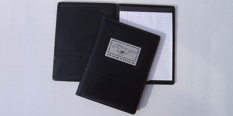This black Ultrahyde portfolios features a finely crafted brushed stainless steel Mustang emblem.The inside front panel contains a flap pocket with 3 horizontal pockets, a pen loop and a refillable 30-page, ruled notepad.