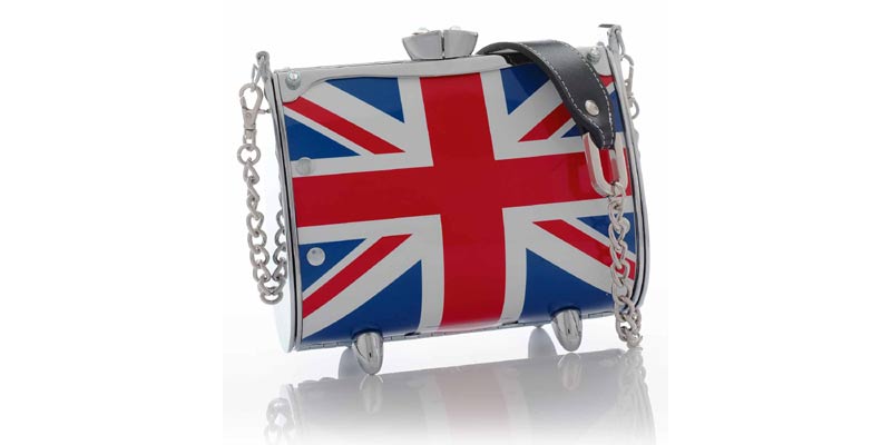 A must-have for every fashionista, the Fenderette handbag is crafted by wrapping two license plates around unique teardrop- shaped chrome ends and, features a crystallized twist-knob closure, a fully-lined velvet interior with velvet pocket and a 21-inch leather/chain strap and a 9-inch rubber handle.