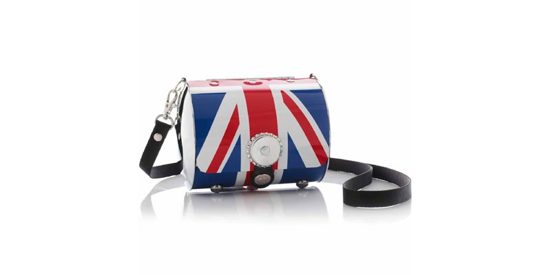 A single license plate is wrapped around two 4-inch chrome hubcaps to create this petite handbag. The Petite features a plush felt lining, an elastic lipstick holder, a bottle cap snap closure and a 48-inch rubber strap.