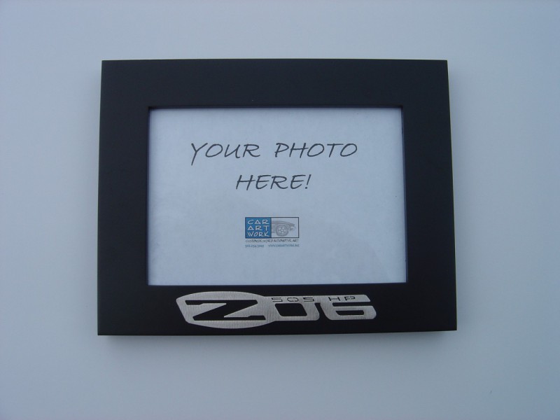 Black wood frame with brushed stainless steel emblem. Frame holds 4x6 photo with mat in and a 5x7 photo with the mat removed. Fold-out easel and hanging hardware attached